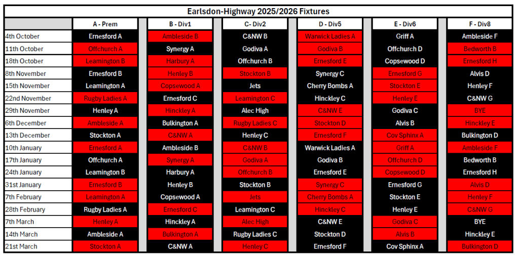 Fixtures for the upcoming 25/26 season are shown below, times and venues are updated and shared on our social platforms each week.